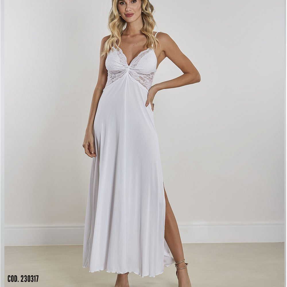 Camisola longa, com detalhes em renda no busto, e fenda lateral.