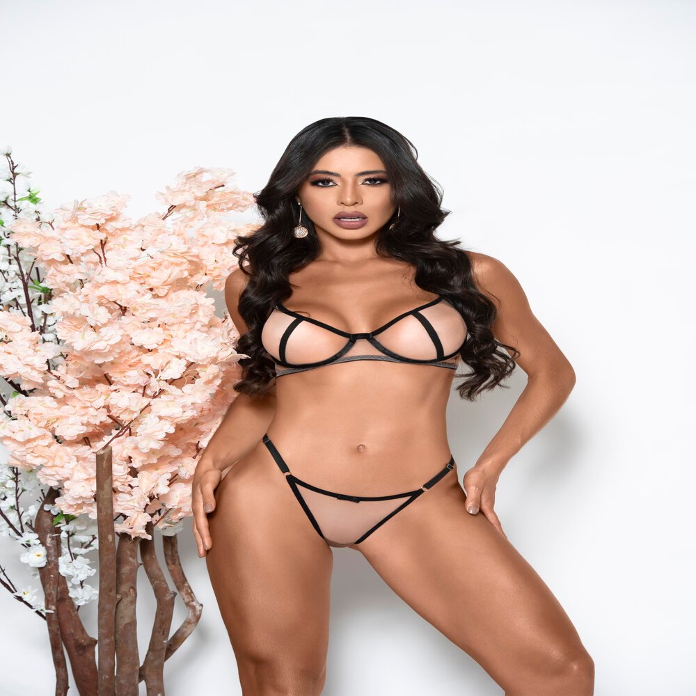 O Conjunto Ilusion é uma peça que exala sensualidade e transparência, composto por calcinha regulável com tule e renda.