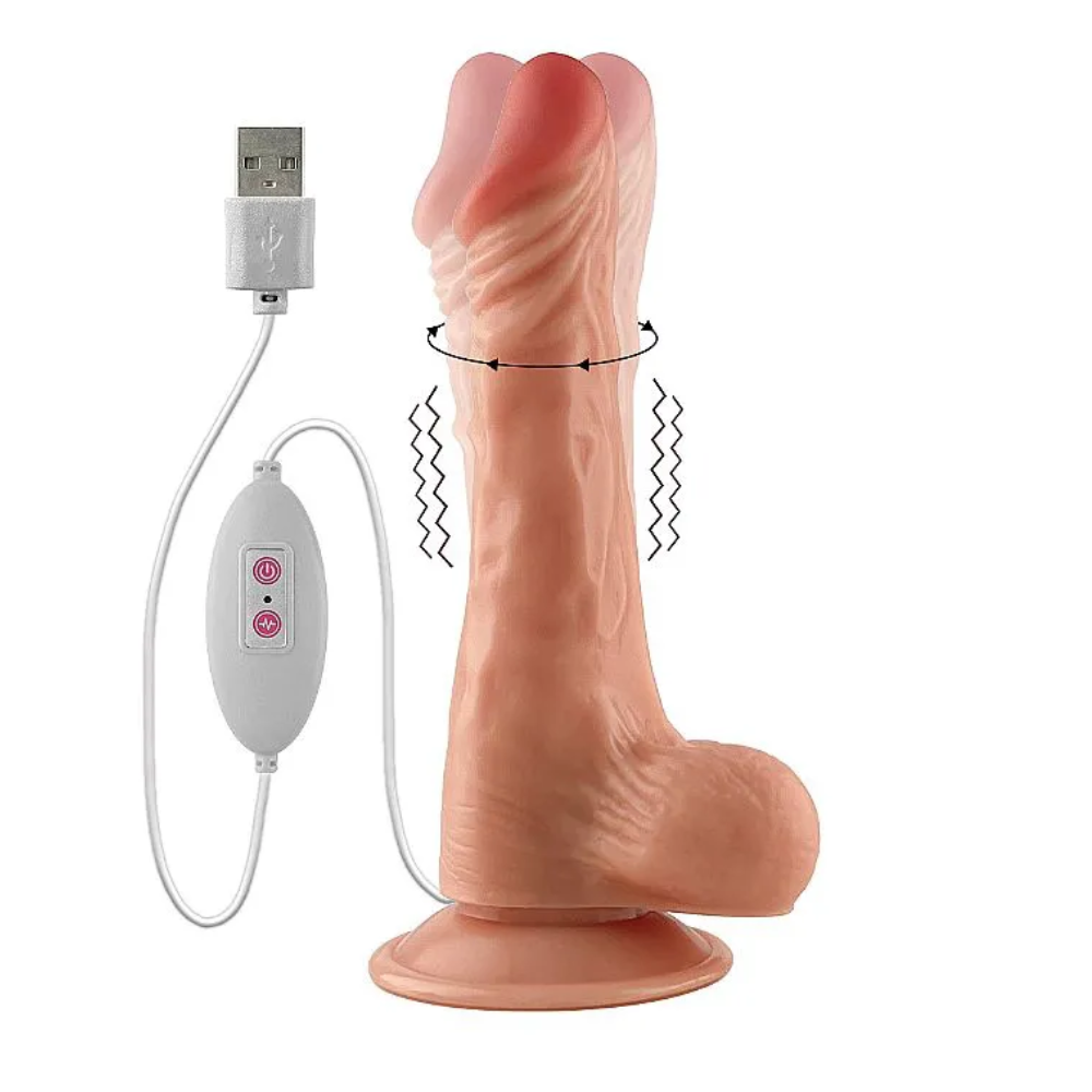 Dildo realístico com rotação e vibração: com incríveis 5 modos de vibração e 5 modos de rotação. confeccionado em silicone. possui glande definida, textura de veias, escroto e ventosa para penetrações em ângulo reto.