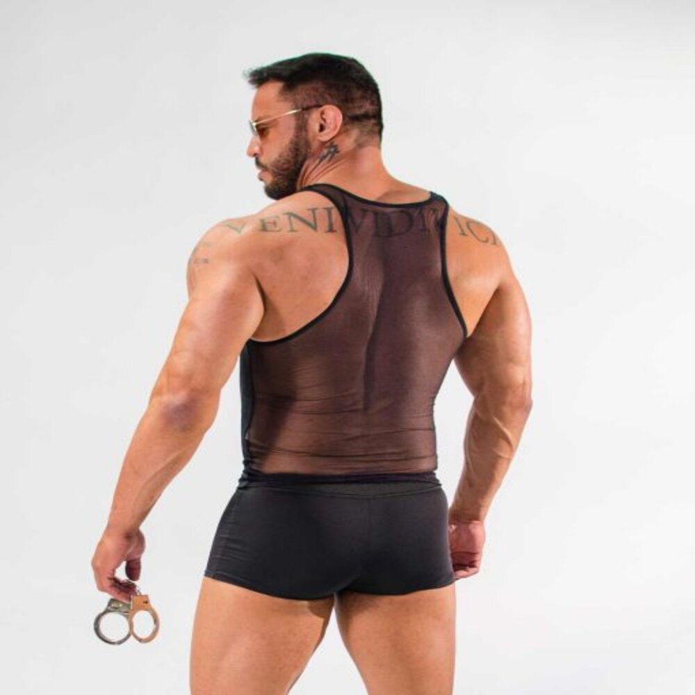 Fantasia feita em Crepe, possui botões prata na frente da camisa e adesivo de policial, cueca com costura nas laterais.